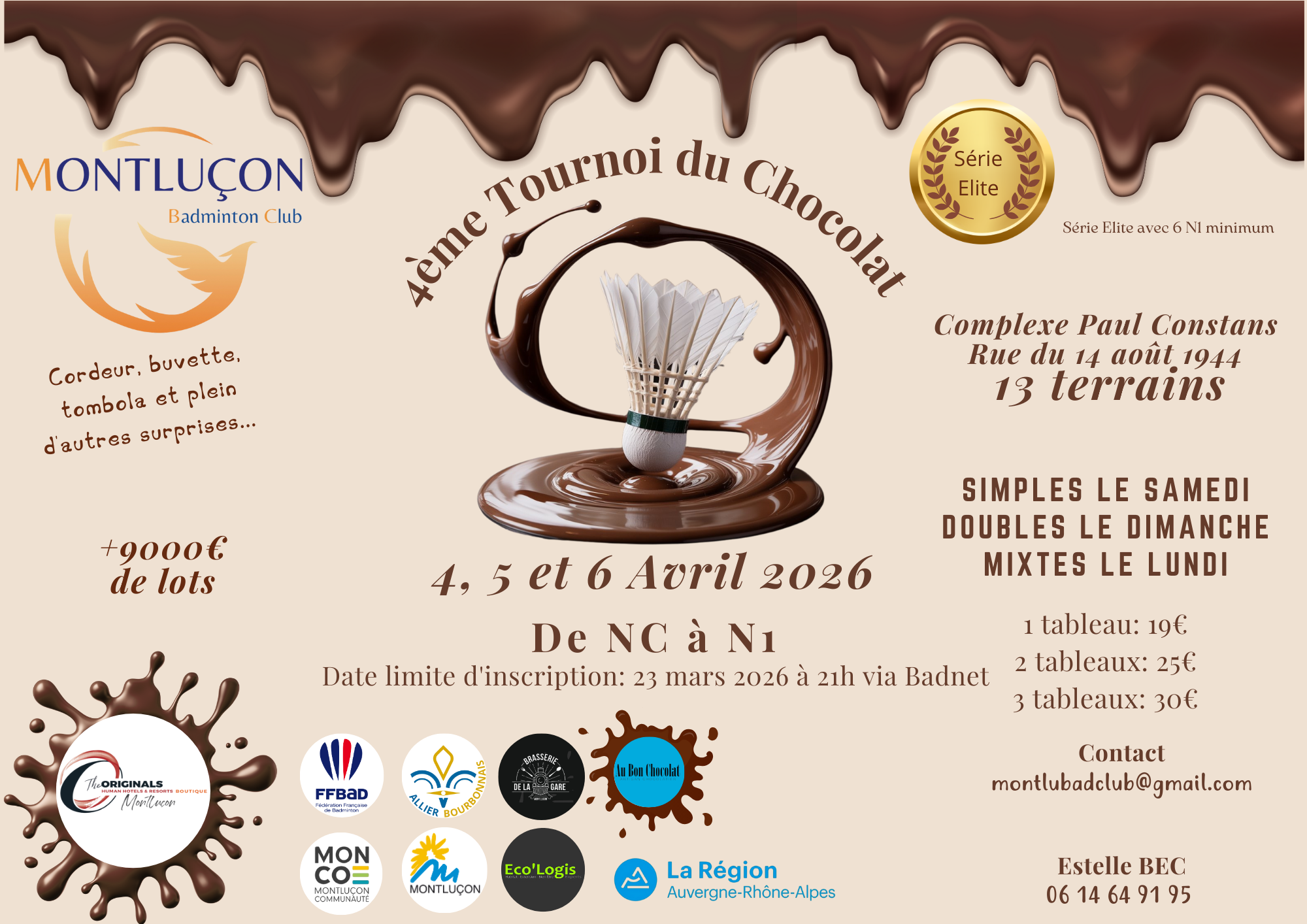 Cette année, notre Tournoi du Chocolat ouvert de NC à N1 se tiendra sur le weekend de Pâques les 4, 5 et 6 avril 2026.